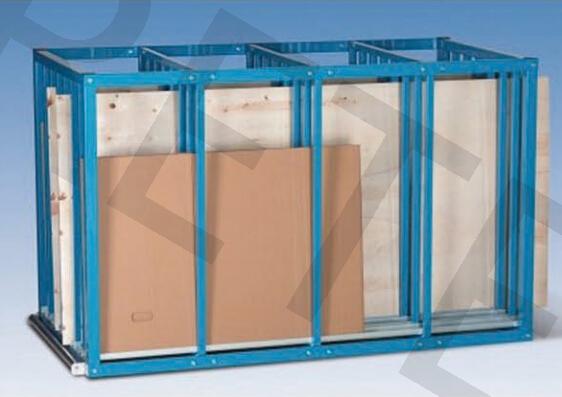 ● 存储笼一边带有钢制滚轴, 可轻松放入板料 ● 用于垂直存放1000× 2000mm, 1250× 2500mm,1500× 3000mm的标准板料, 可存放7排板料 ● 钢制结构, 表面蓝色喷粉 散件出货, 拆装方便, 平板包装节省存储空间 最大可存储1500×3000mm的板料端头可配插入式挡板 如需其他规格, 请来电垂询!